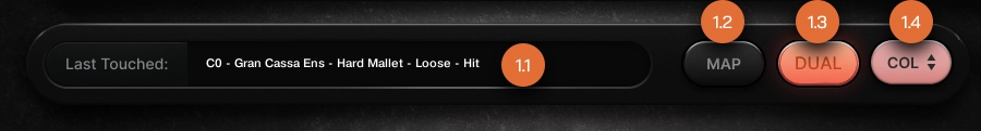 Toggles dual mode, adding an additional adjacent and higher key assignment for the last-touched instrument. This enables double-finger playing techniques, allowing rapid and expressive triggering of percussion with alternating fingers for enhanced performance fluidity.